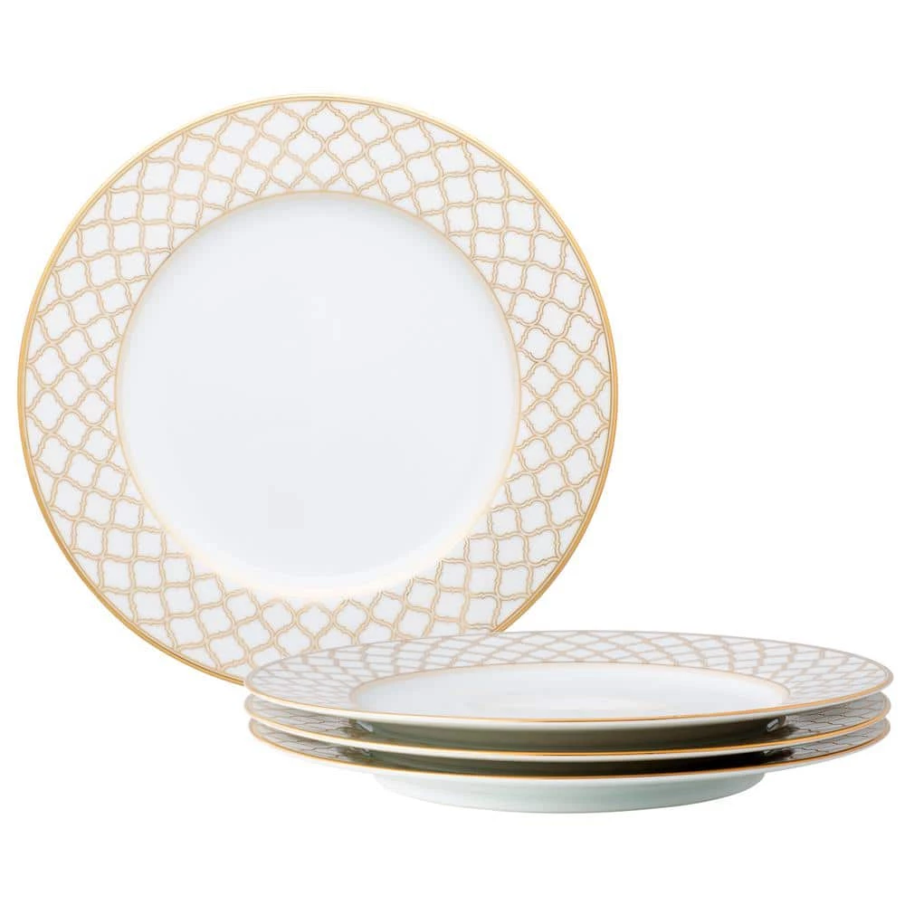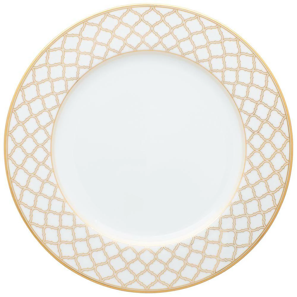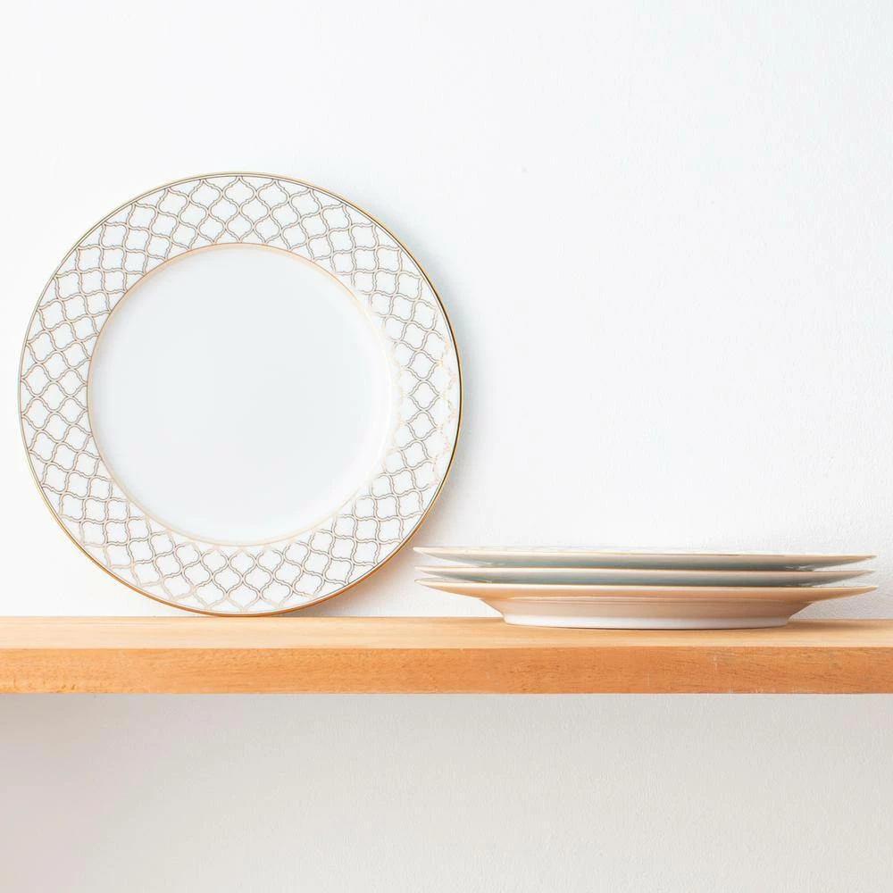Eternal Palace Gold features an interlocking stylized ogee design, presented in multiple sizes on different pieces for maximum impact. These modern elements are paired with solid presentations of cream and classic gold banding on white porcelain. Eternal Palace Gold is suitable for everyday use and is dishwasher safe.