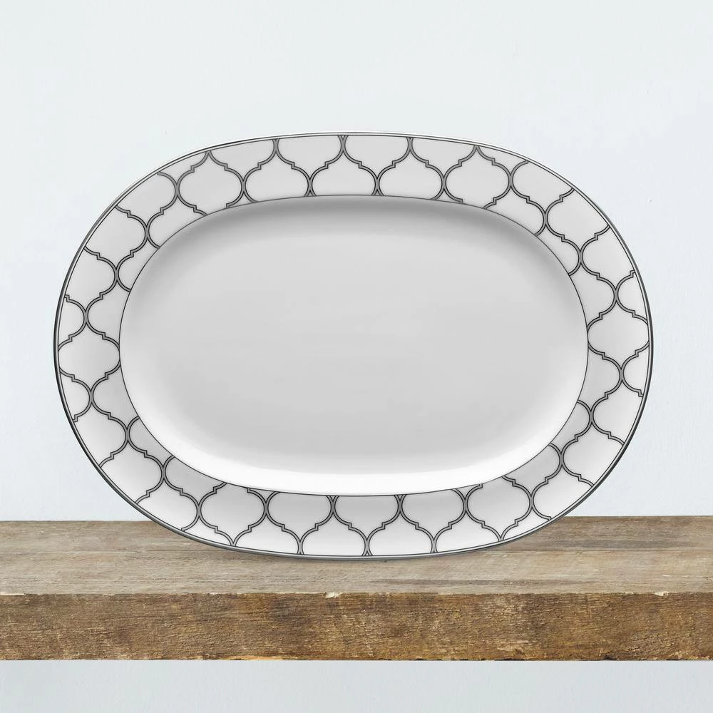Eternal Palace features an interlocking stylized ogee design, presented in multiple sizes on different pieces for maximum impact. These modern elements are paired with solid presentations of a silvery-grey and classic platinum banding on white porcelain. Eternal Palace is suitable for everyday use and is dishwasher safe!