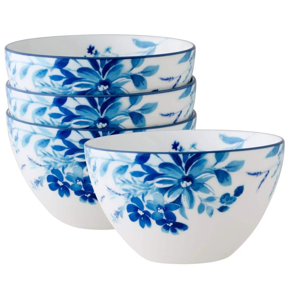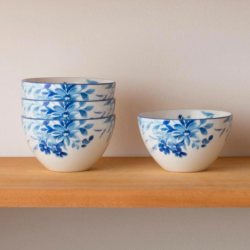 6 in., 29.5 oz. White/Blue Blossom Road White Porcelain Cereal Bowls (Set of 4) by Noritake