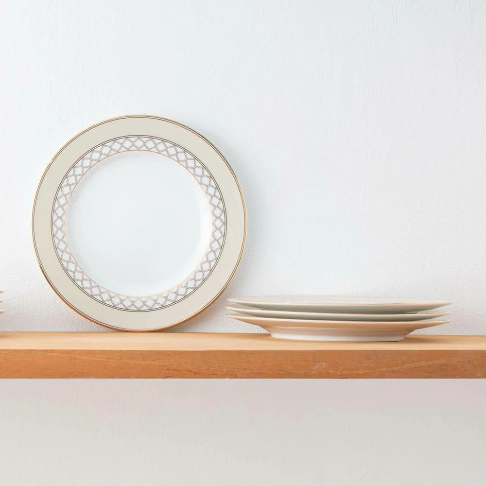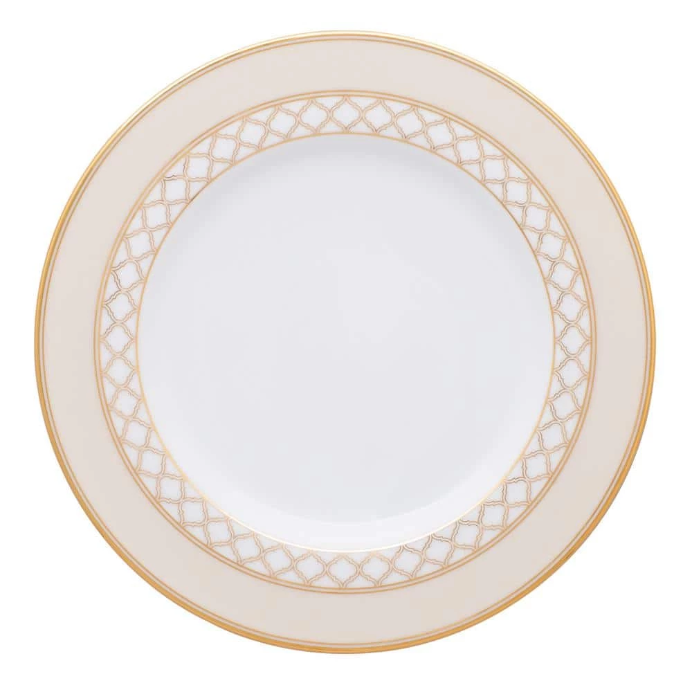 Eternal Palace Gold features an interlocking stylized ogee design, presented in multiple sizes on different pieces for maximum impact. These modern elements are paired with solid presentations of cream and classic gold banding on white porcelain. Eternal Palace Gold is suitable for everyday use and is dishwasher safe.