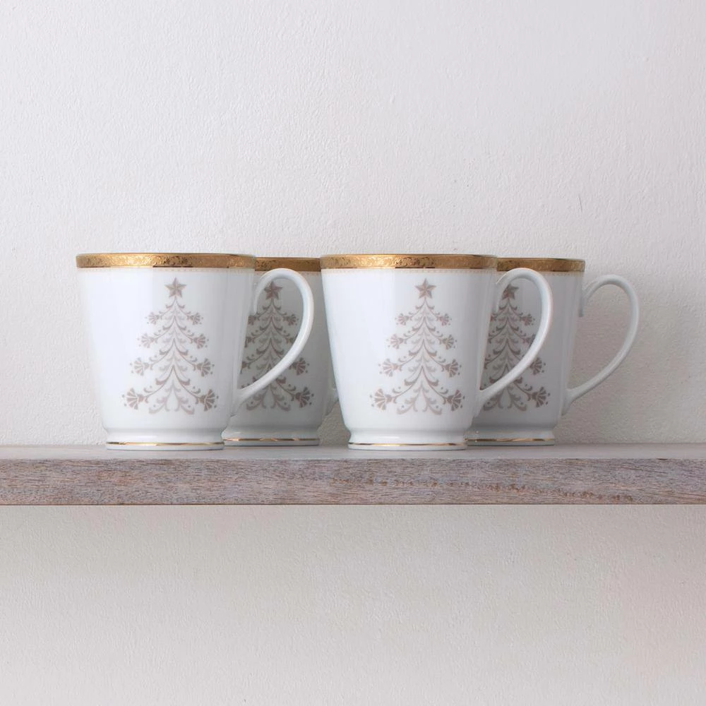 Charlotta Gold is a beautifully classic collection in white porcelain, featuring the modern addition of microwave-safe gold. Newly introduced in 2021 is a set of holiday accessories. Mugs and accent plates are introduced in 2 different holiday designs. The Harvest items feature leaves, pine cones, and berries in a muted bronze color, while the Tree items showcase a stylized Christmas tree in silvery-grey. Charlotta Gold is durable and dishwasher safe.