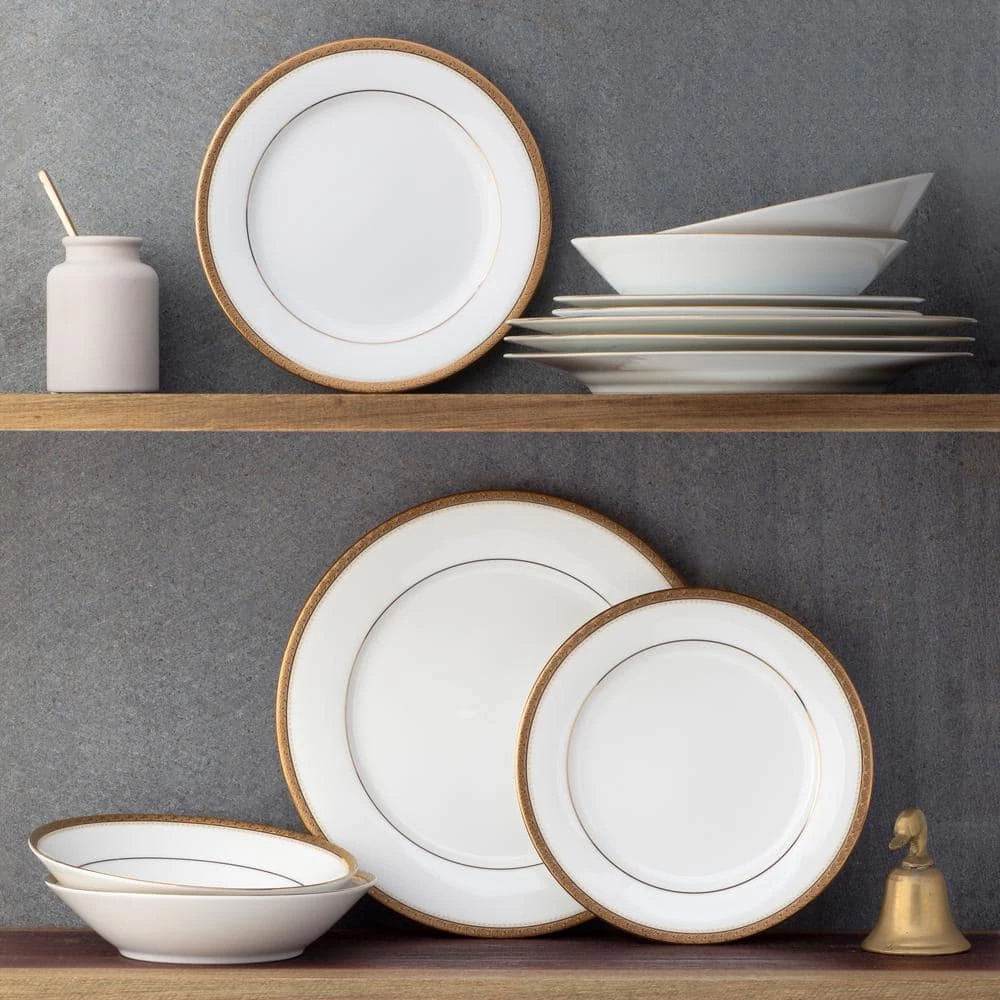 Charlotta Gold is a beautifully classic collection in white porcelain, featuring the modern addition of microwave-safe gold. The prominent gold banding features flowers and scrolling leaves. Perfect for elegant dinners while casual enough for daily use.