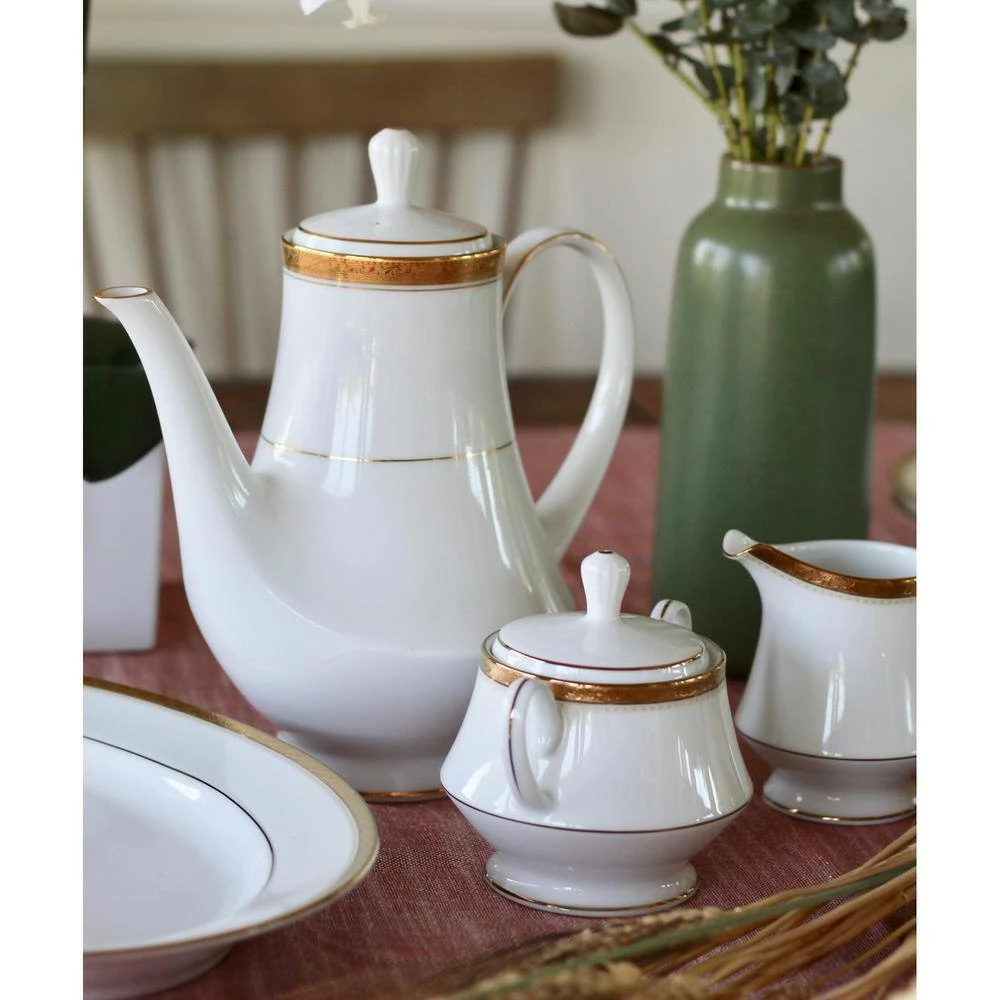 Charlotta Gold is a beautifully classic collection in white porcelain, featuring the modern addition of microwave-safe gold. The prominent gold banding features flowers and scrolling leaves. It’s perfect for elegant dinners while casual enough for daily use.