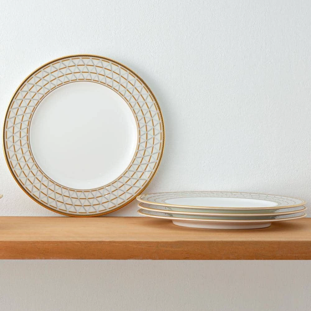 Crochet is a stunning, strongly-geometric dinnerware pattern on bone china. The mixture of gold and platinum in the design brings the versatility of mixed metals to the table. The deep red color brings a sense of elegance and dramatic ambience. Crochet is suitable for everyday use and is dishwasher safe.