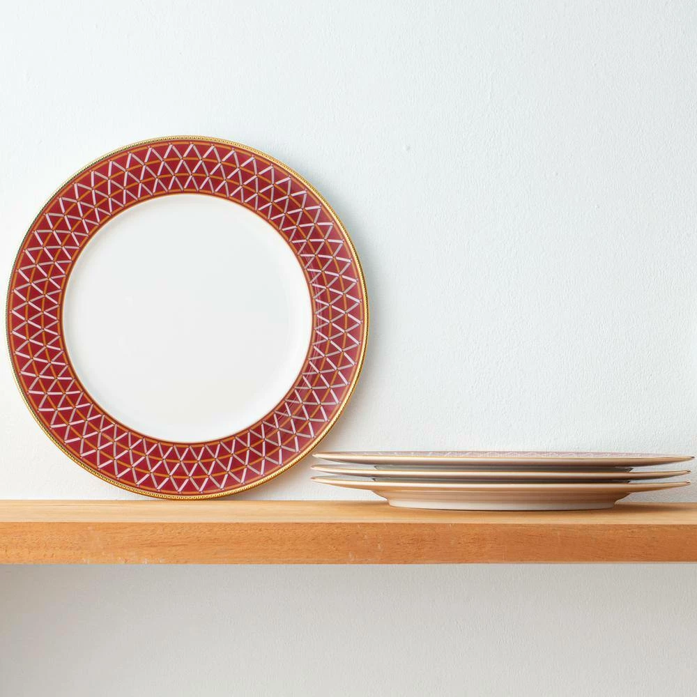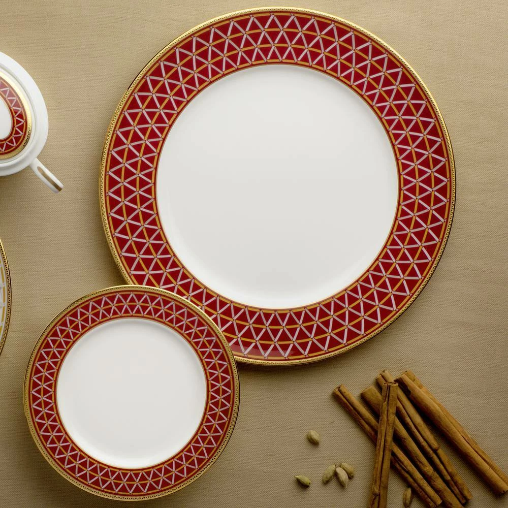 Crochet is a stunning, strongly-geometric dinnerware pattern on bone china. The mixture of gold and platinum in the design brings the versatility of mixed metals to the table. The deep red color brings a sense of elegance and dramatic ambience. Crochet is suitable for everyday use and is dishwasher safe.