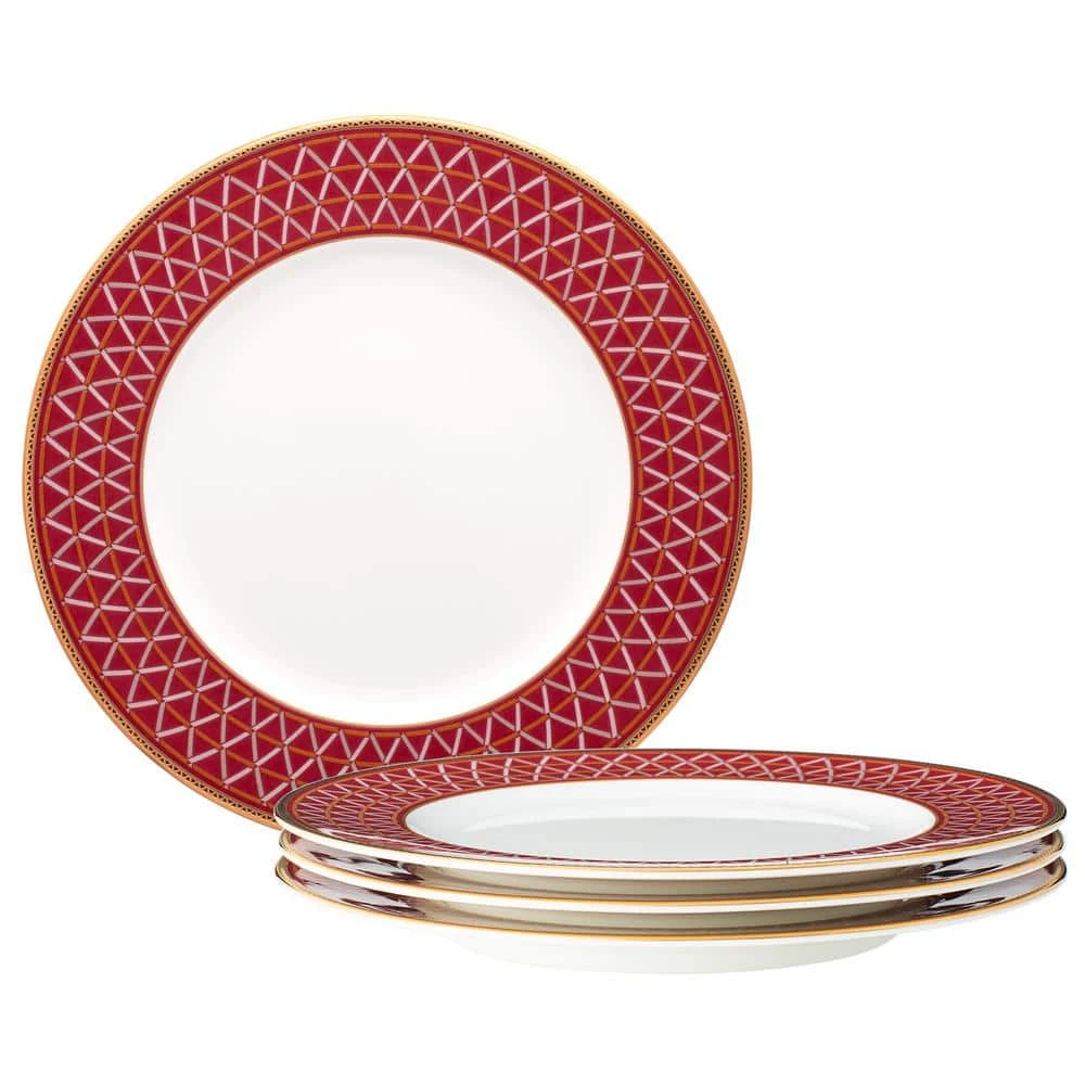 Crochet is a stunning, strongly-geometric dinnerware pattern on bone china. The mixture of gold and platinum in the design brings the versatility of mixed metals to the table. The deep red color brings a sense of elegance and dramatic ambience. Crochet is suitable for everyday use and is dishwasher safe.