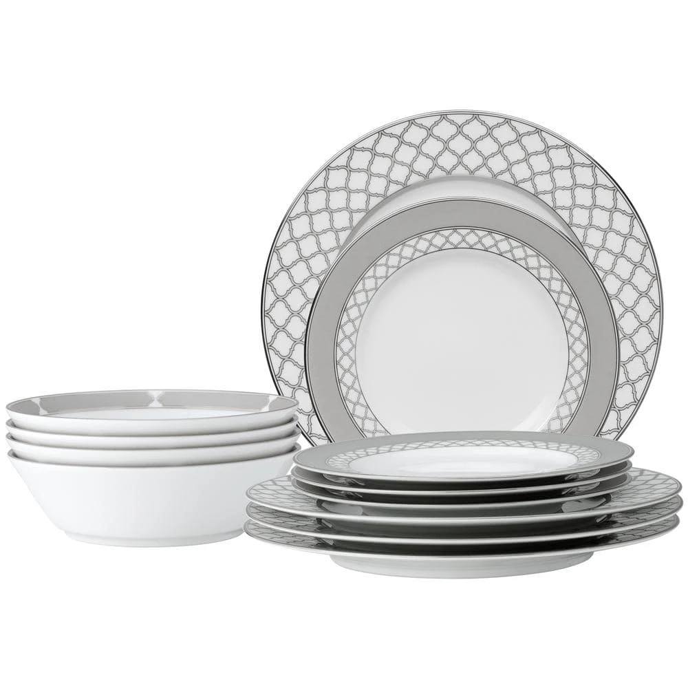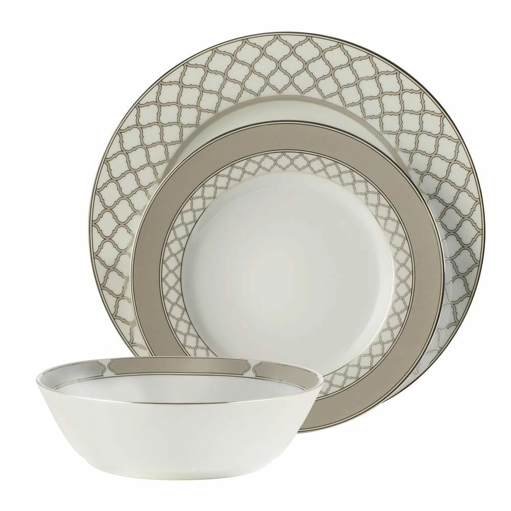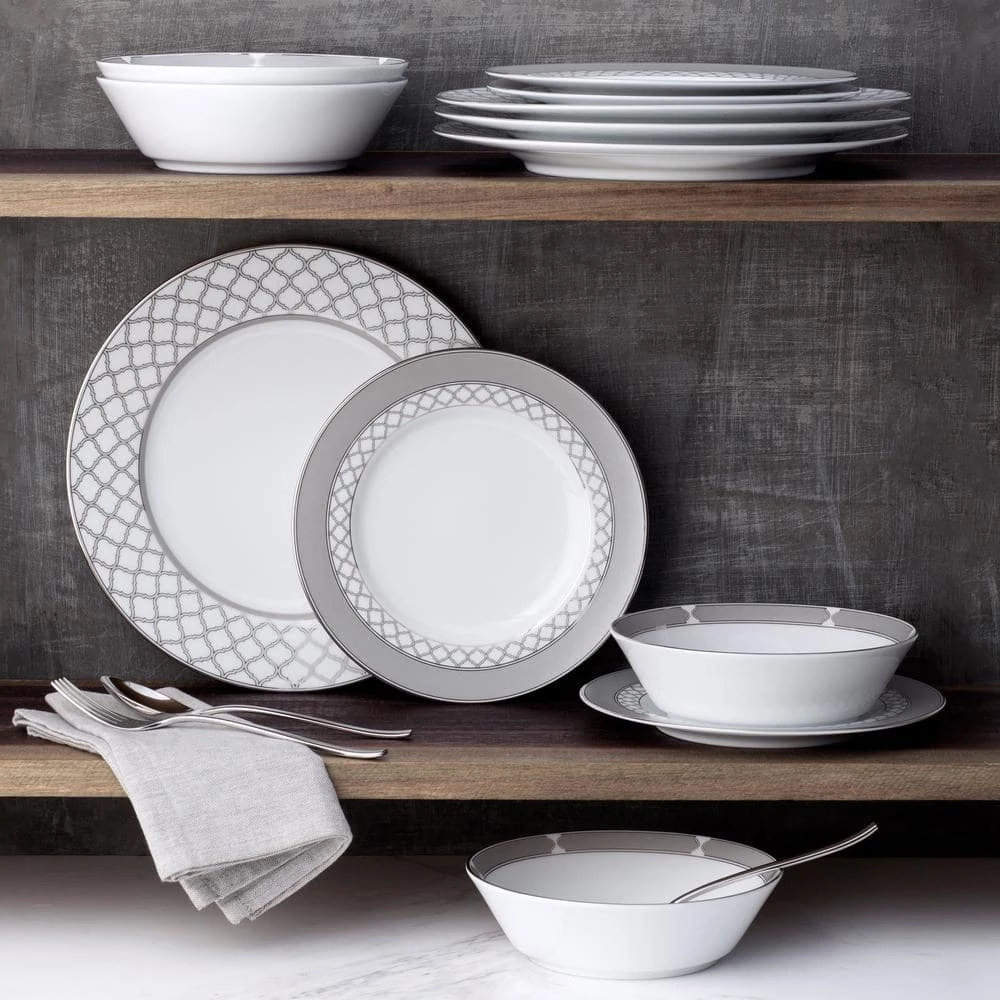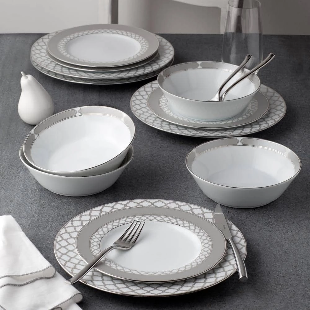 Eternal Palace features an interlocking styled ogee design. This design is presented in varying sizes on different items in the collection to achieve maximum impact and to create visual depth on the table. These elements are paired with solid presentations of silvery-grey coloring and platinum banding.