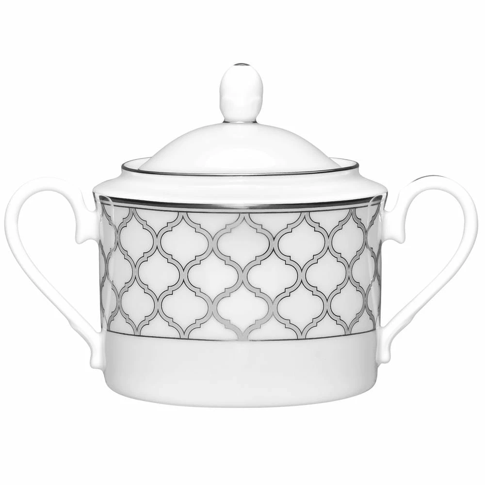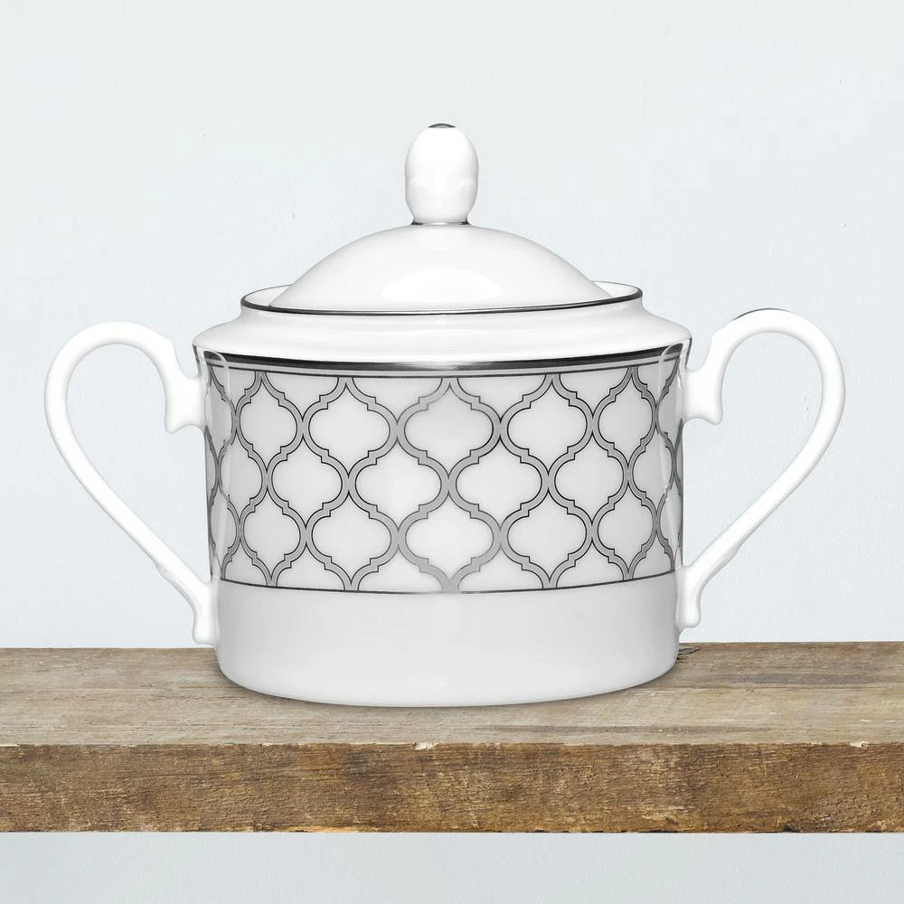 Eternal Palace features an interlocking stylized ogee design, presented in multiple sizes on different pieces for maximum impact. These modern elements are paired with solid presentations of a silvery-grey and classic platinum banding on white porcelain. Eternal Palace is suitable for everyday use and is dishwasher safe!