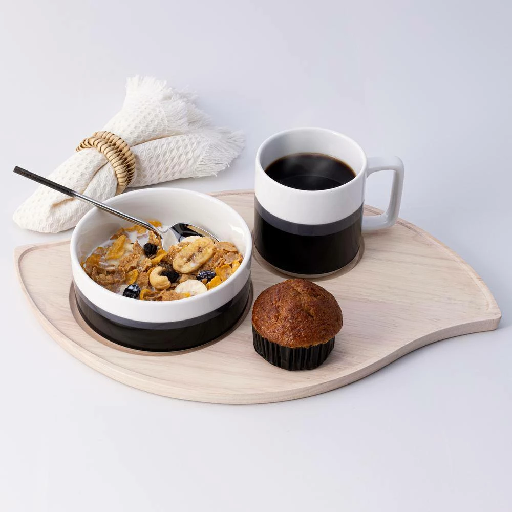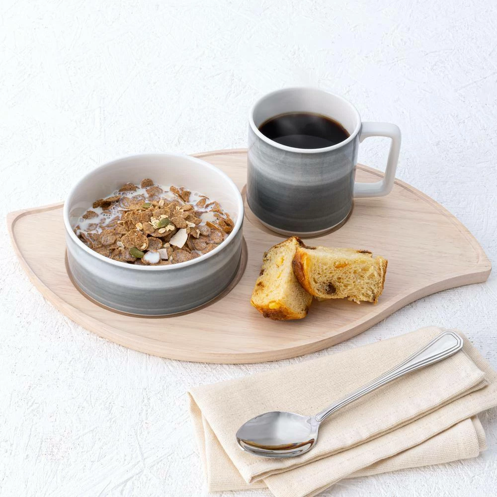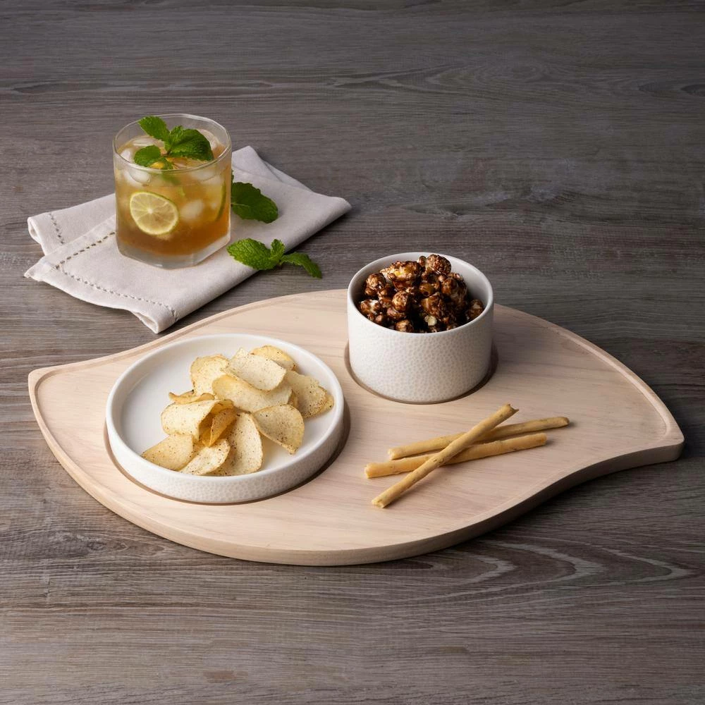 Hammock Wood items are made of wood from the Pará rubber tree. It features a finished blonde color, subtly accentuating the natural wood grain. This collection works well on its own or coordinating with the Hammock dinnerware collection.