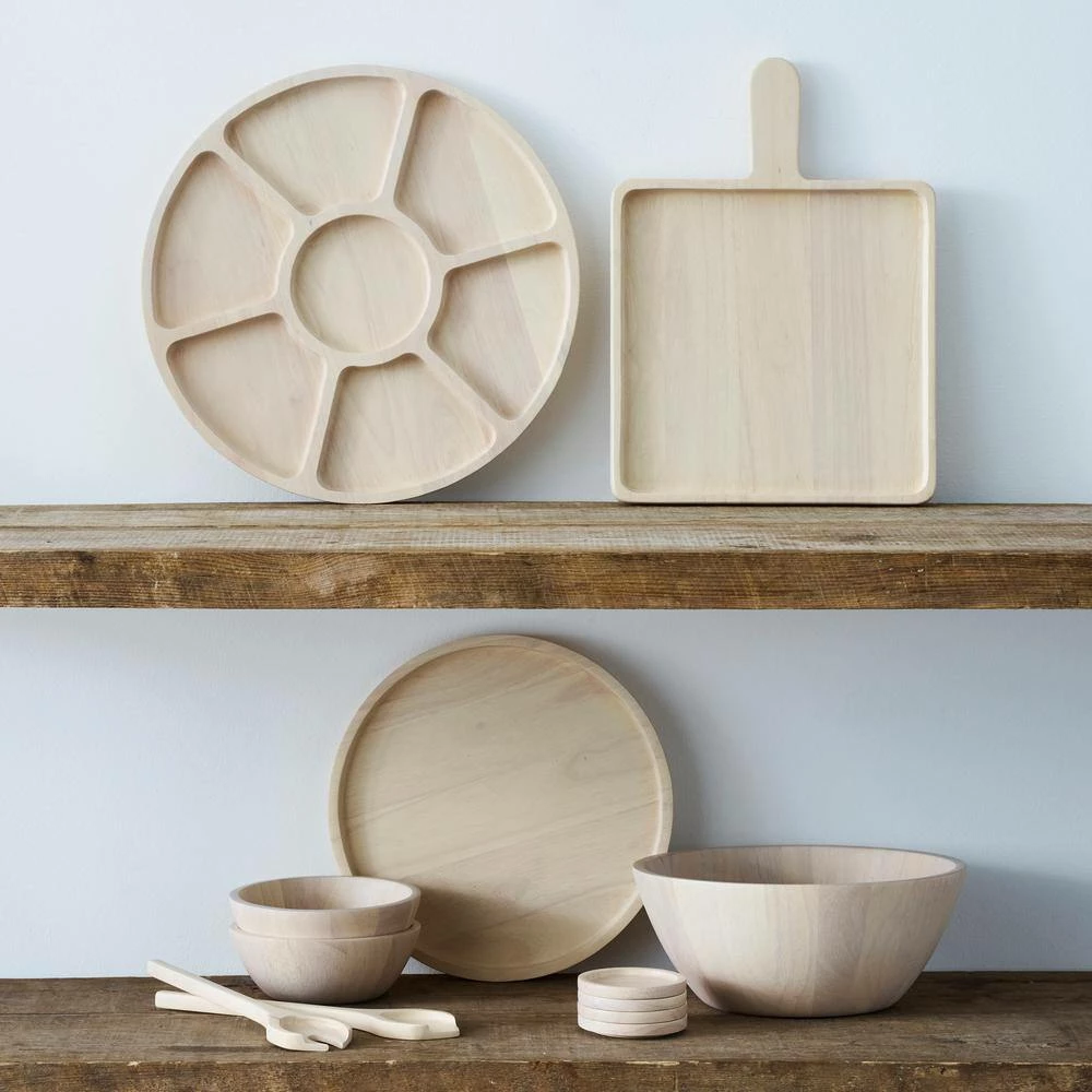 Hammock Wood items are made of wood from the Par rubber tree, featuring a finished blonde color, subtly accentuating the natural wood grain. This collection works well on its own or coordinating with the Hammock dinnerware collection. This collection is hand-wash only.