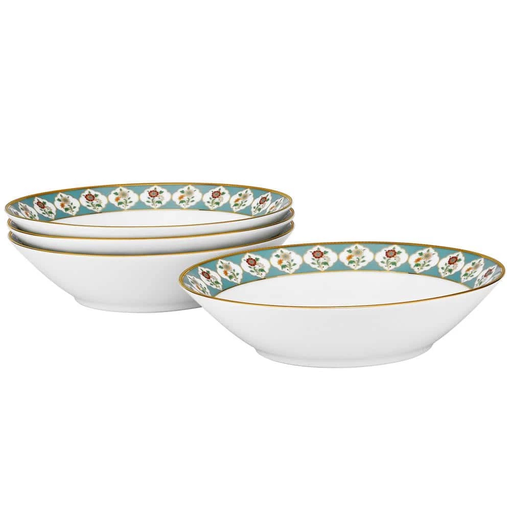 Lodi’s Morning is a white porcelain pattern, featuring designs inspired by the famous Lodi Gardens in India. The salad plate depicts striking florals and a parakeet in a beautiful blue shade with touches of saffron and ruby, while the other items feature a bold rim of florals within a repeating ogee border. The salad plate also features a parakeet. A delicate gold outer edge banding finishes this delightful pattern. Lodi’s Morning is dishwasher safe and intended for daily use.