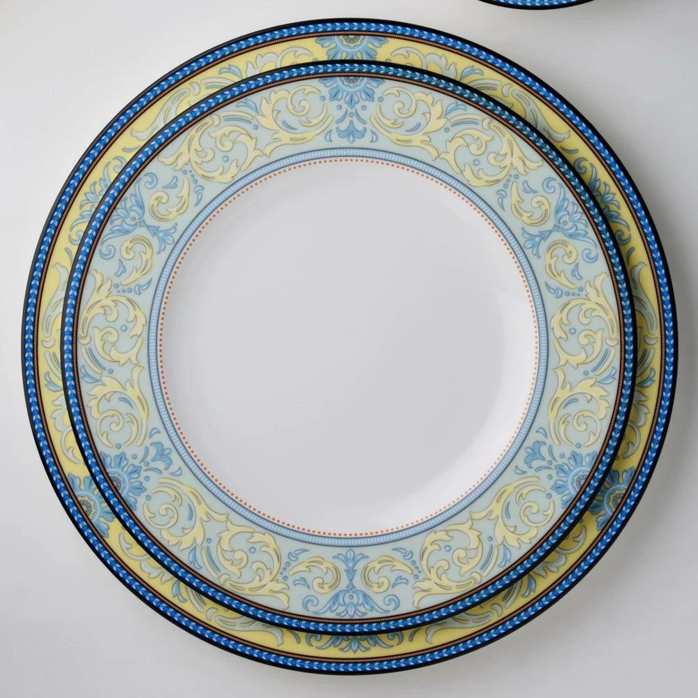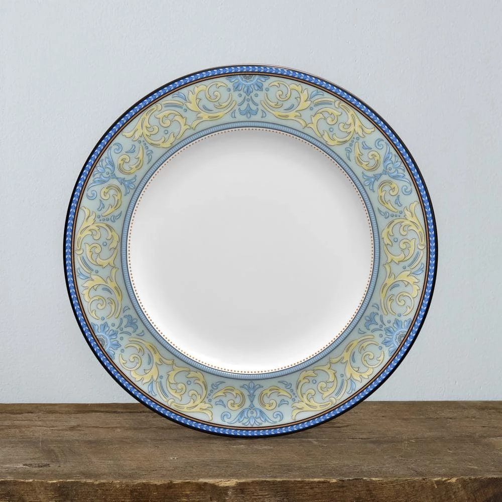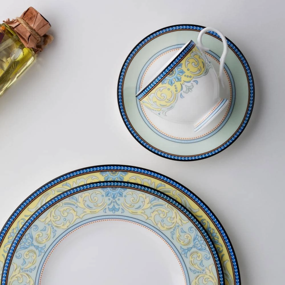 Menorca Palace is inspired by Italian pottery designs from the Renaissance period. This versatile pattern features classic scrolling design elements in yellow and blue. The non metallic banding on this bone china pattern results in Menorca Palace being both microwave and dishwasher safe.