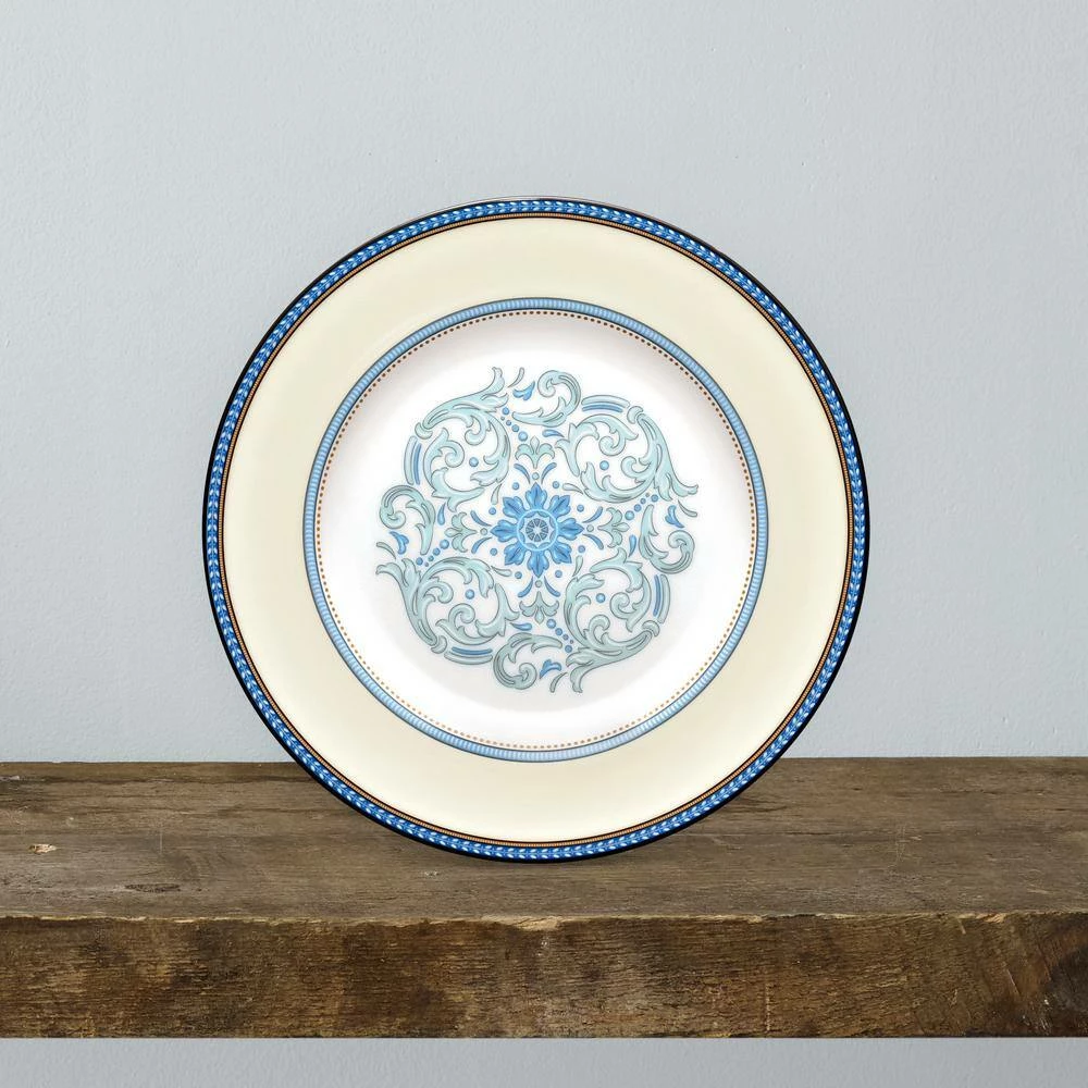 Menorca Palace is inspired by Italian pottery designs from the Renaissance period. This versatile pattern features classic scrolling design elements in yellow and blue. The non-metallic banding on this bone china pattern results in Menorca Palace being both microwave and dishwasher safe.