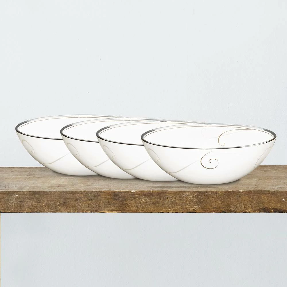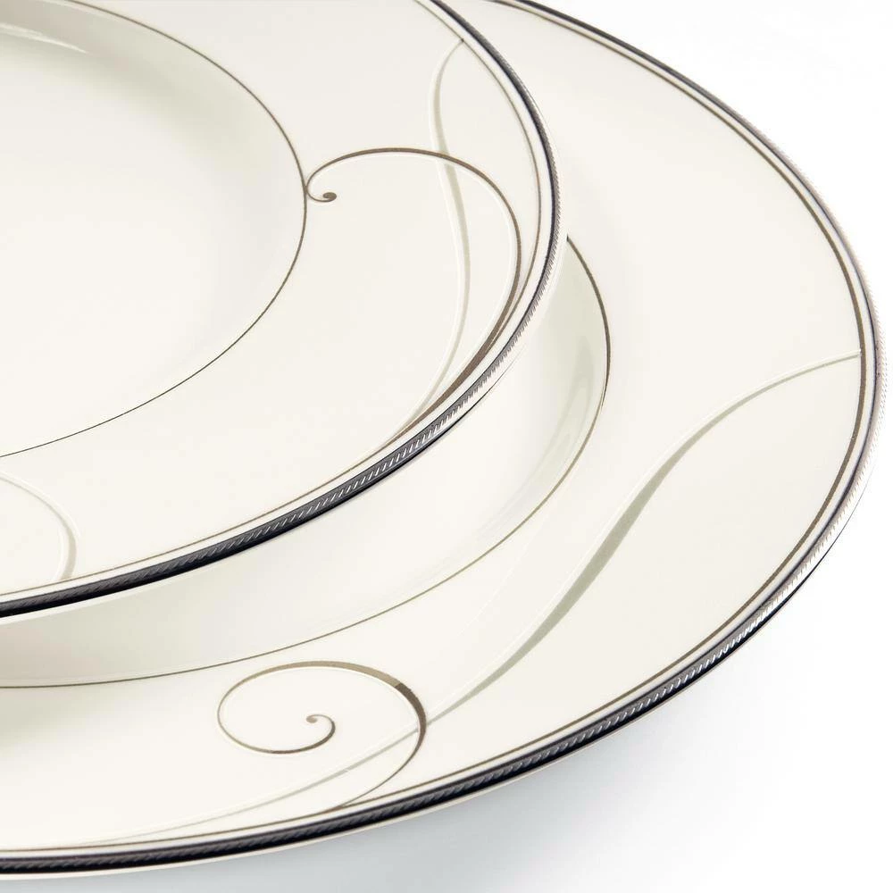Platinum Wave is a more relaxed approach to formal dinnerware. Keeping to a simple modern feeling, this pattern interprets a classic scroll motif in an updated and playful manner. Washing against the rim of the plate, the platinum waves create a bold, yet elegant presentation. Square and round place settings, as well as a large variety of accessories, result in numerous opportunities for personalization and variety on your table.