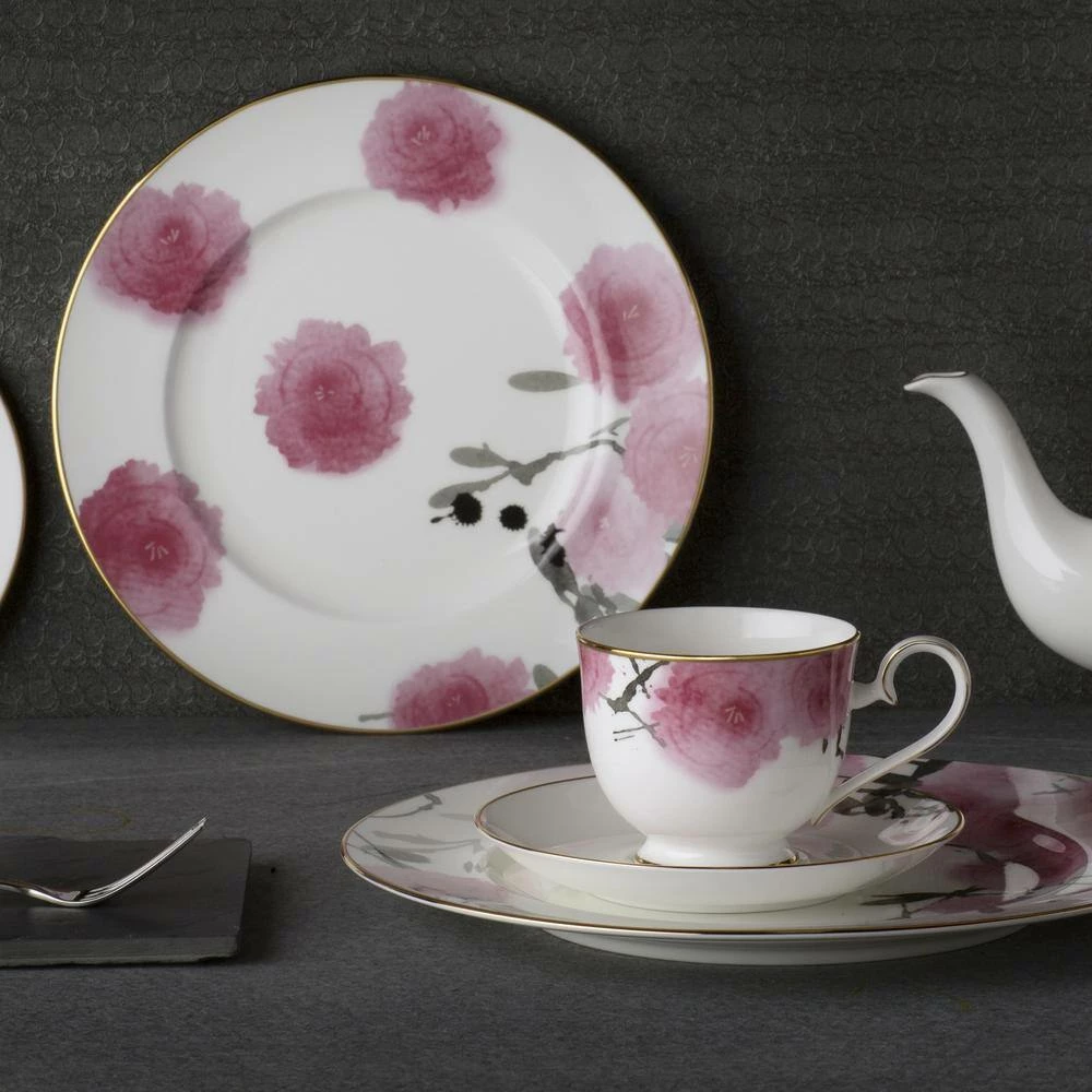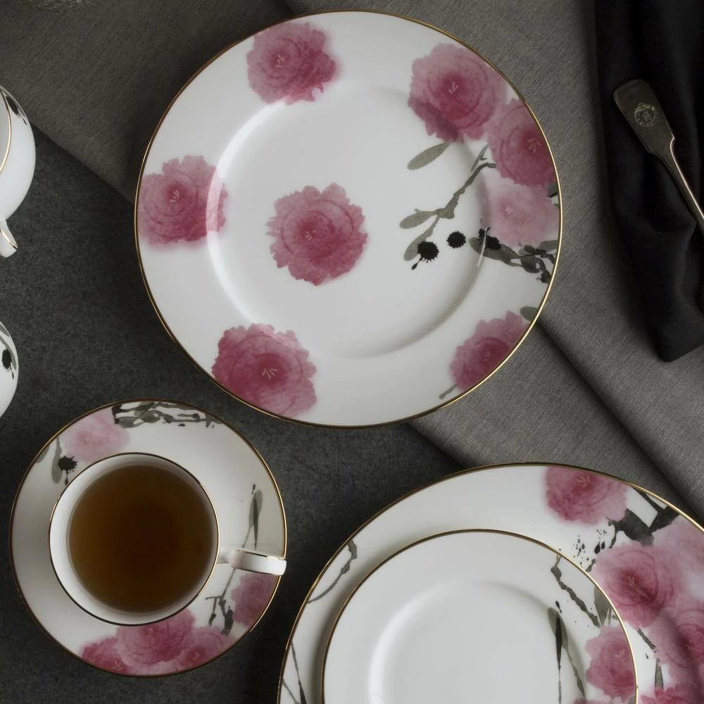 The cherry blossom flowers that adorn items in Yae are created in a lush watercolor technique that creates a colorful and elegant effect. The contrast of the pink flowers is paired with branches created with an ink-brush painting method. Yae is crafted in fine bone china with gold banding, is suitable for everyday use and is dishwasher safe.